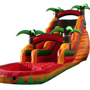 Our Red Tropical Water Slide Perfect for Luaus or Tropical themed parties! Make your way to the top where the rainbow shines brightly between the palm trees then plunge down into the pool of water!