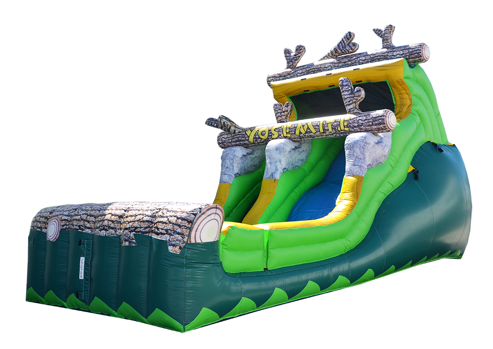 The 18ft Yosemite Water Slide has front loading stairs which are safe for all ages and quickly gets you to the top of this awesome slide, then plummet all the way down the slide into the landing at the end.  No pool at the bottom so its safe & perfect for all ages!