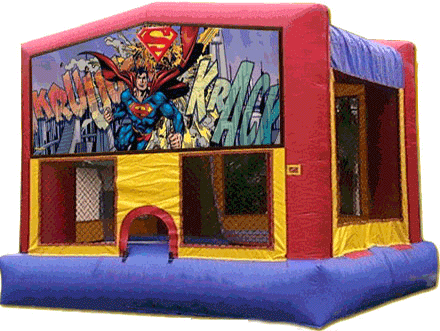 Jump Up, Up & Away with Superman as he breaks through walls and his cape blowing in the wind. The Man of Steel’s S Logo above the great city of Metropolis below is an awesome attraction to your Childs party. Your Super Hero party will be the talk of the town with our Superman Bounce House!